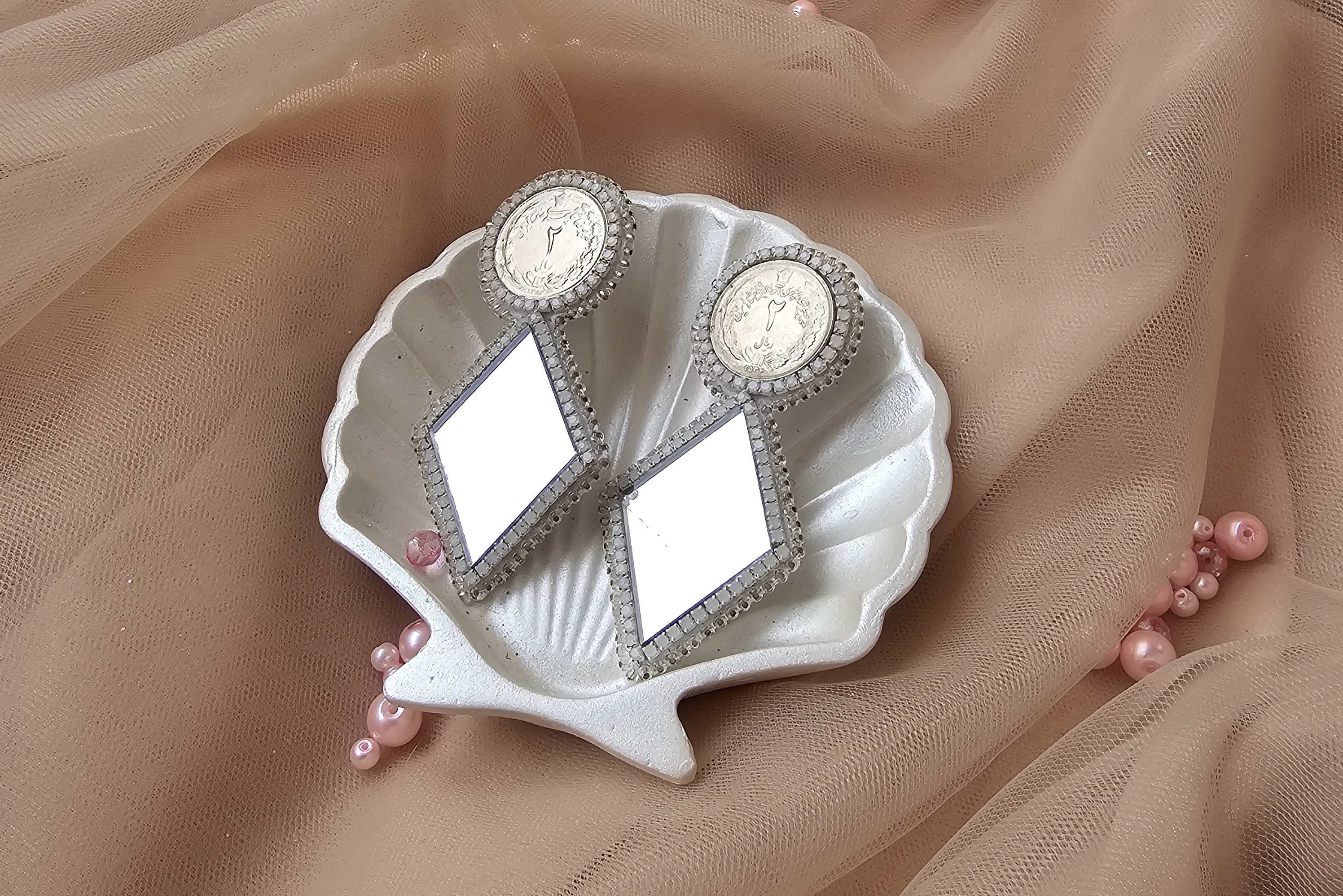 گوشواره دست ساز جواهردوزی زنانه با سکه 2 ریالی و آینه لوزی