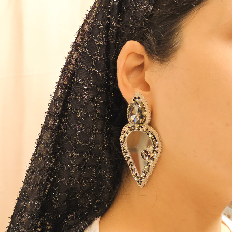 این گوشواره دست ساز جواهردوزی با ترکیب سنگ دودی اشکی و گرد،آینه اشکی و نگین مولتی کالر طراحی شده است.دوخت ظریف و متریال با کیفیت در کنار درخشندگی خیره کننده سنگها، آن را به انتخابی ایده آل برای استایلهای مجلسی وخاص تبدیل می کند.این گوشواره ها جلوه ای لوکس و شیک به استایل شما می بخشد و مناسب خانمهایی ست که به دنبال متفاوت بودن و جلوه خاص هستند.