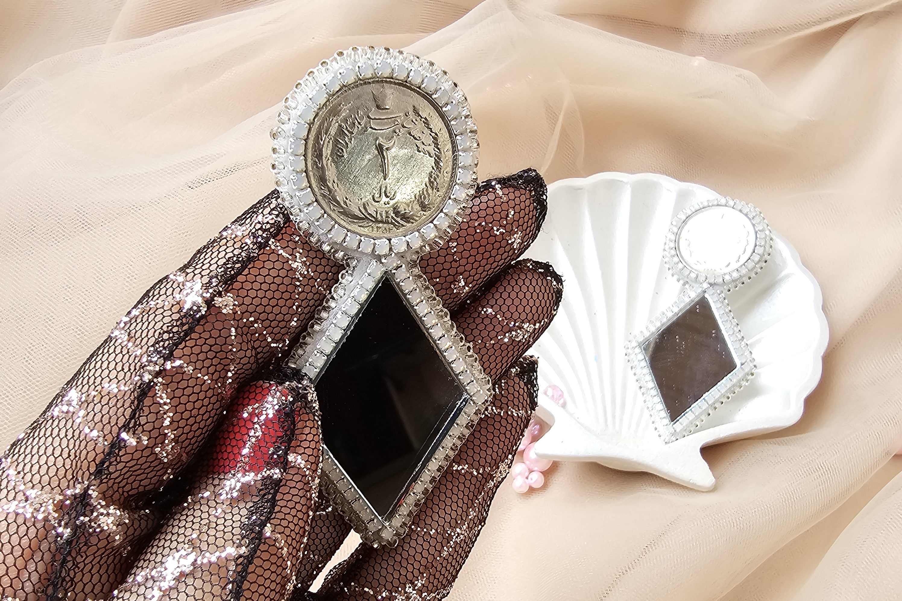 این گوشواره دست ساز جواهردوزی با ترکیب سکه2 ریالی شاهنشاهی،آینه لوزی شکل و نگین متری طراحی شده است.دوخت ظریف و متریال با کیفیت در کنار درخشندگی خیره کننده سنگها، آن را به انتخابی ایده آل برای استایلهای مجلسی،روزمره،خاص تبدیل می کند.این گوشواره ها جلوه ای لوکس،شیک و خاص به استایل شما می بخشد و مناسب خانمهایی ست که به دنبال متفاوت بودن،ظرافت و جلوه خاص هستند.