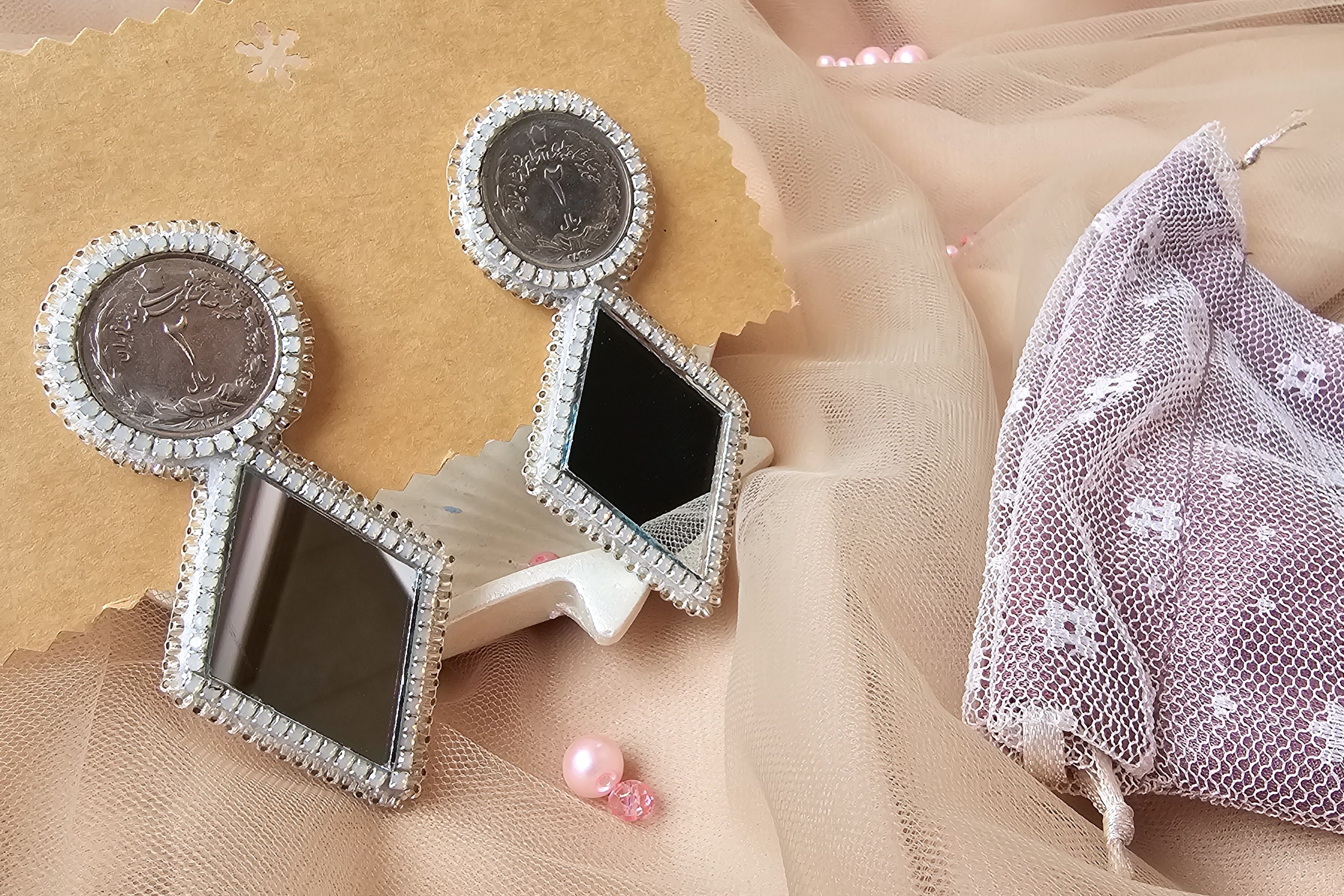 گوشواره دست ساز جواهردوزی زنانه با سکه 2 ریالی و آینه لوزی